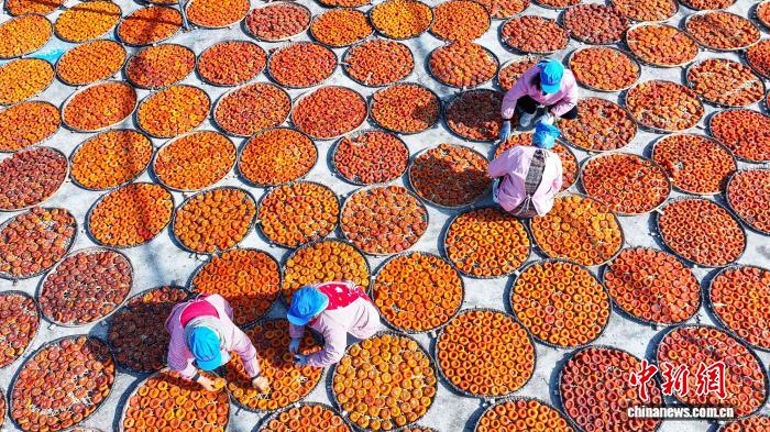 图为12月14日,平乐县沙子镇加工企业工人在翻晒柿饼。(无人机照片)杨宗盛 摄