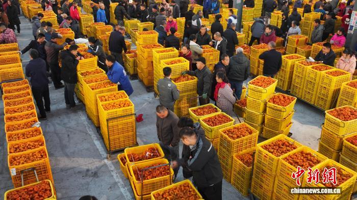 图为12月14日,平乐县沙子镇柿饼交易集市现场。(无人机照片)杨宗盛 摄