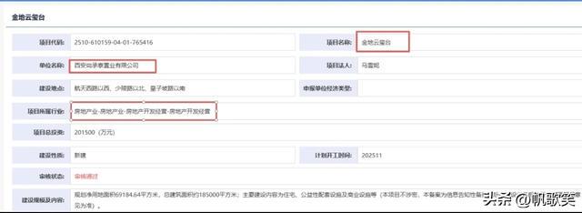 公开信息显示,金地云玺台项目位于西安航天基地航天西路以西、少陵路以北、皇子坡路以南,规划净用地面积69184.64平方米(103.777亩),项目总投资20.15亿元,由西安尚承泰置业有限公司开发,总建筑面积约185000平方米,地块容积率1.2-1.96,绿地率不低于35%,主要建设内容为住宅、公益性配套设施及商业设施等,计划开工时间是2025年11月。